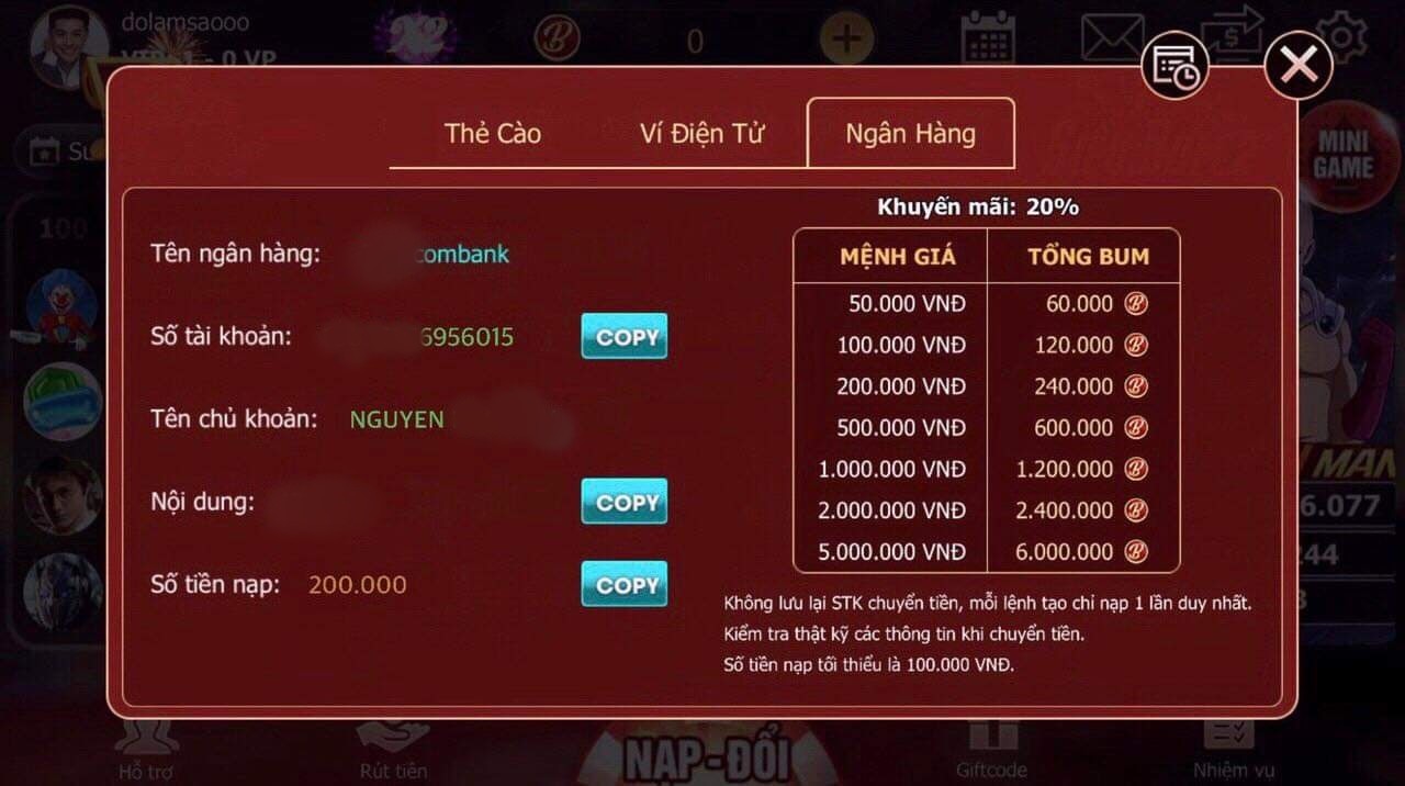 Sau khi kiểm tra đầy đủ, người chơi điền thông tin tài khoản nhận tiền bao gồm tên ngân hàng, số tài khoản, tên chủ tài khoản (trùng với thông tin đăng ký) và số tiền cần rút. Tiếp đó, hệ thống sẽ gửi mã xác nhận hoặc yêu cầu người chơi nhập mật khẩu giao dịch để đảm bảo tính bảo mật.